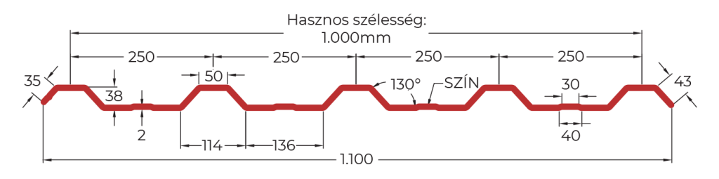 A 38-as trapézlemezek felhasználása, profilmagasságából eredendően tetőfelületeken alkalmazott. 5 bordás megjelenése elegánssá és vonzóvá teszi a lakossági felhasználók körében, de egyre inkább megjelenik az ipari igények kiszolgálása. Merevségének kulcsa a megnövelt bordamagasságokon túl, a borda-közökben kialakítátott mikrobordákban rejlik. Ezeknek köszönhetően, alátámasztási igénye jelentősen csökken a kisebb profilmagasságú trapézlemezekhez viszonyítva, így akár már 100-120cm távolságba is elhelyezhetők a tartószerkezeti elemek egymástól. Fontos megjegyezni, hogy a pontos alátámasztási igényt megfelelő szakemberek számítják ki. Ehhez nyújtunk segítséget a Tervezési segédlet trapézlemezekhez kiadványunkkal. A 38-as trapézlemezek antikondenzáltan és nélküle is rendelkezik Tűzvédelmi Megfelelőségi Igazolással (TMI). Tűzállósági határérték: RE30